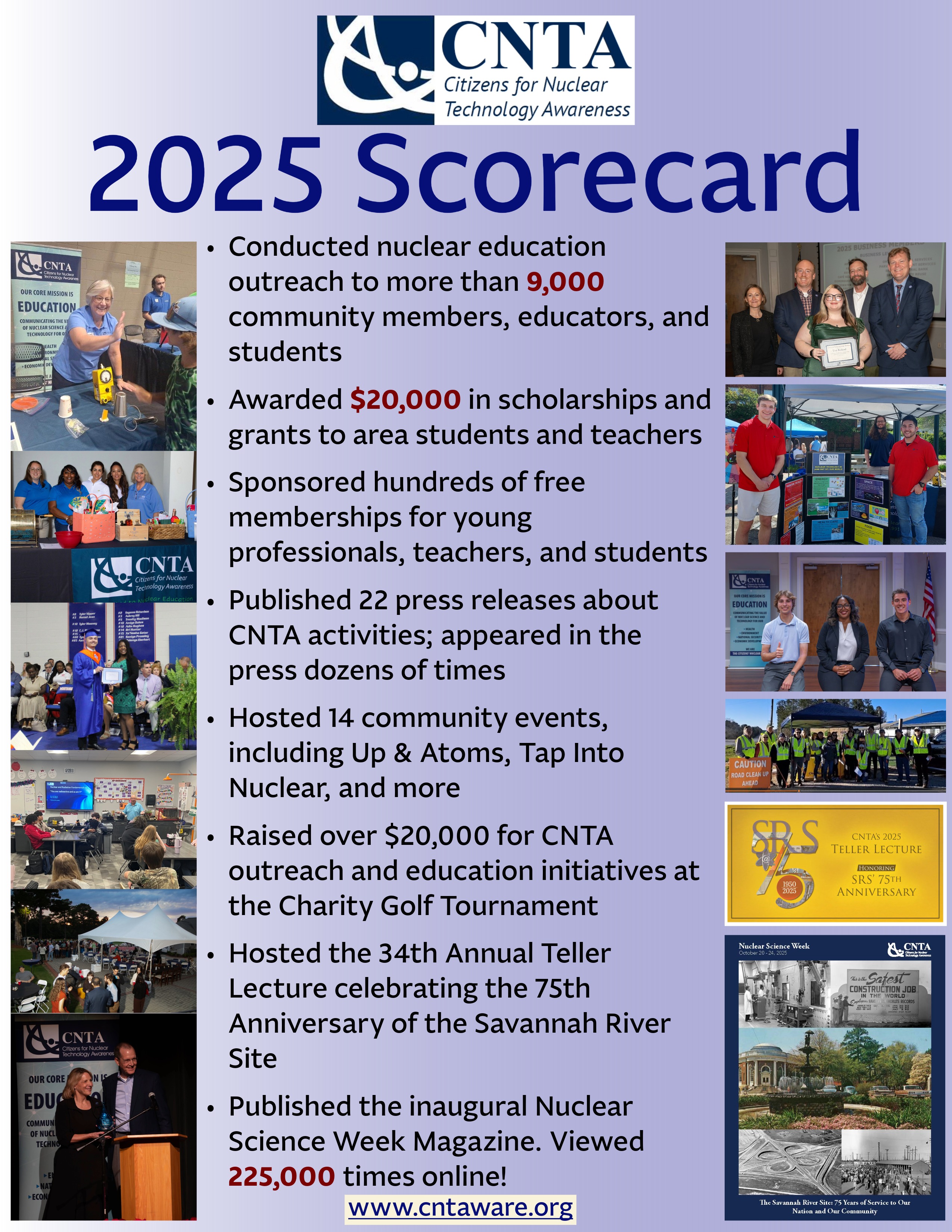 In 1991, a handful of citizens and a few companies in the Central Savannah River Area of South Carolina and Georgia banded together to form a nonprofit, grassroots organization that would be pro-nuclear and proud of it. We carry out educational programs to provide factual information about the benefits and risks of nuclear technologies and the Savannah River Site.