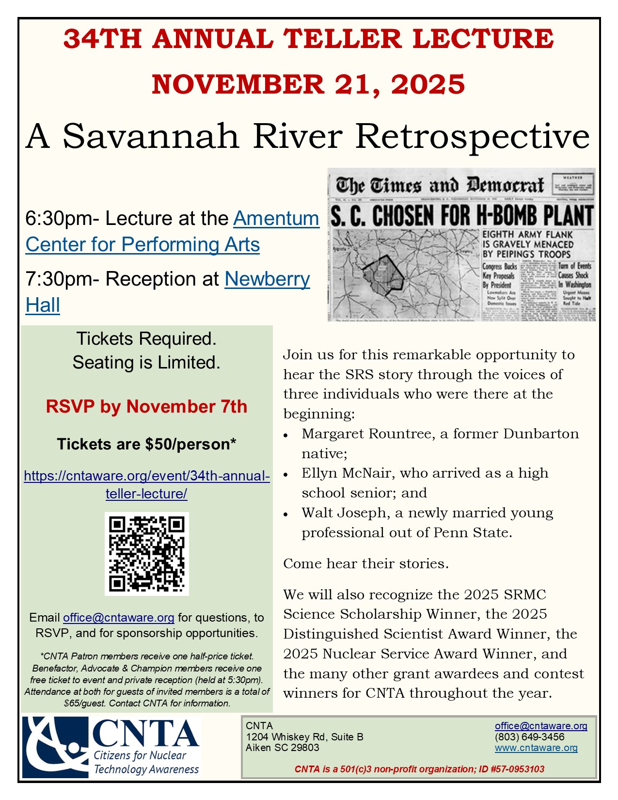Our 34th Annual Teller Lecture & Banquet will celebrate the 75 year history of the Savannah River Site. 2025 Teller Lecture Sponsorship Information has information on the specifics of the event and sponsorship options.